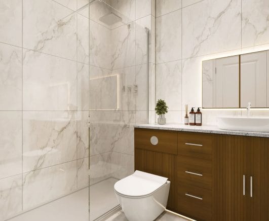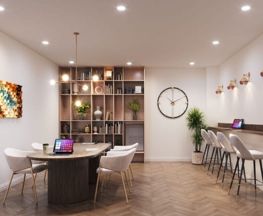 Each apartment at Forum House showcases a high specification, featuring handleless kitchens fitted with Bosch appliances, sleek quartz worktops, and stylish porcelain-tiled bathrooms. Residents benefit from app-enabled heating and lighting controls and pre-installed gigabit-fibre broadband connections for seamless modern living.